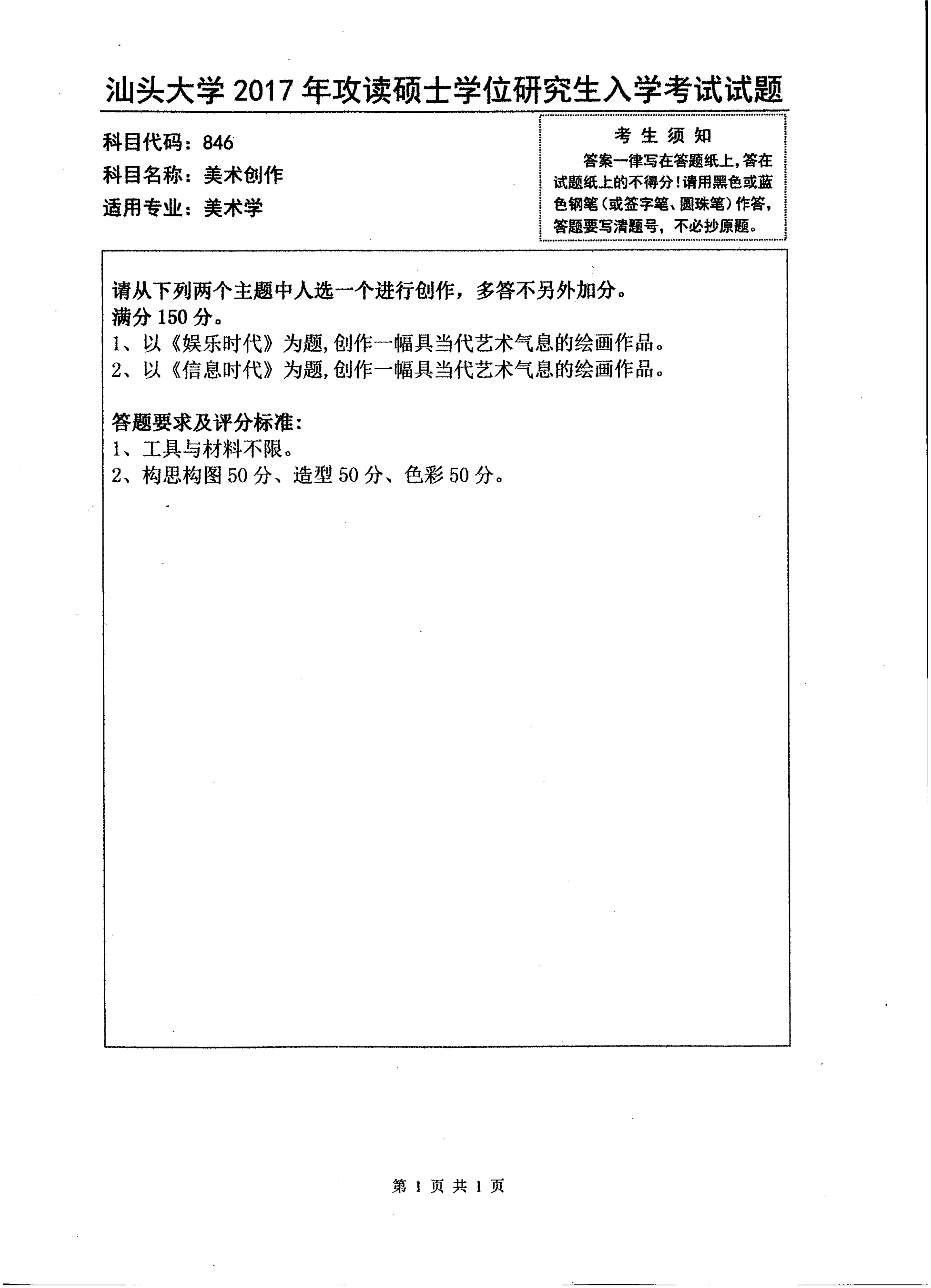 汕头大学考研辅导班:2017年汕头大学考研846美术创作真题