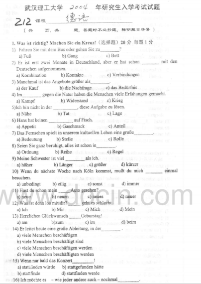 2020-2021年武汉理工考研辅导班:2004年武汉理工大学242德语考研真题
