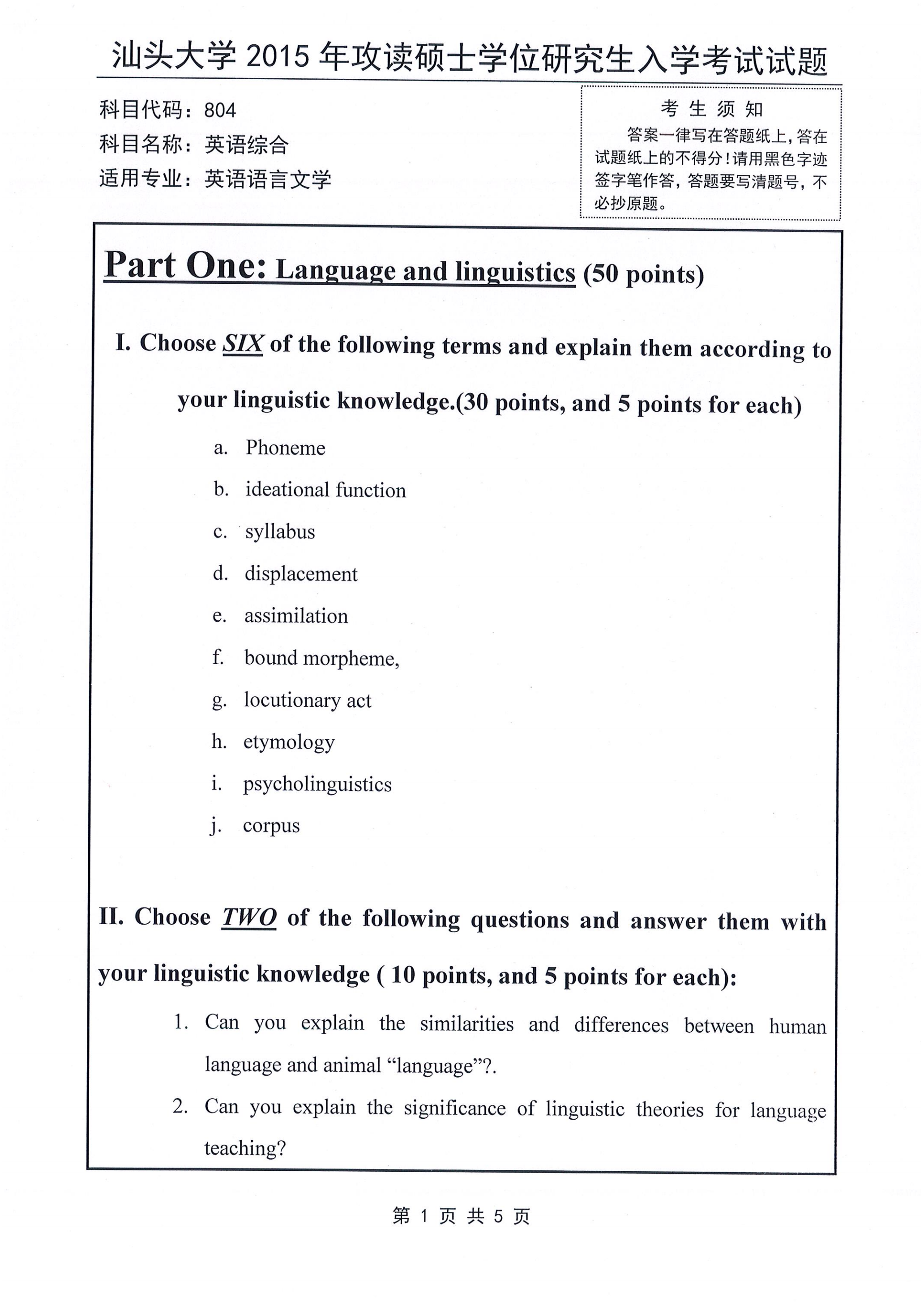 汕头大学考研辅导班:2015年汕头大学804英语综合考研真题