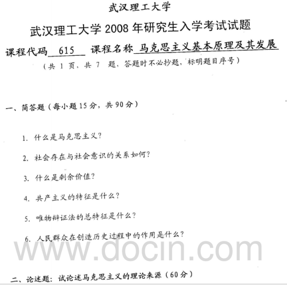 2020-2021年武汉理工考研辅导班:武汉理工大学615马克思主义基本原理及其发展2008年考研真题