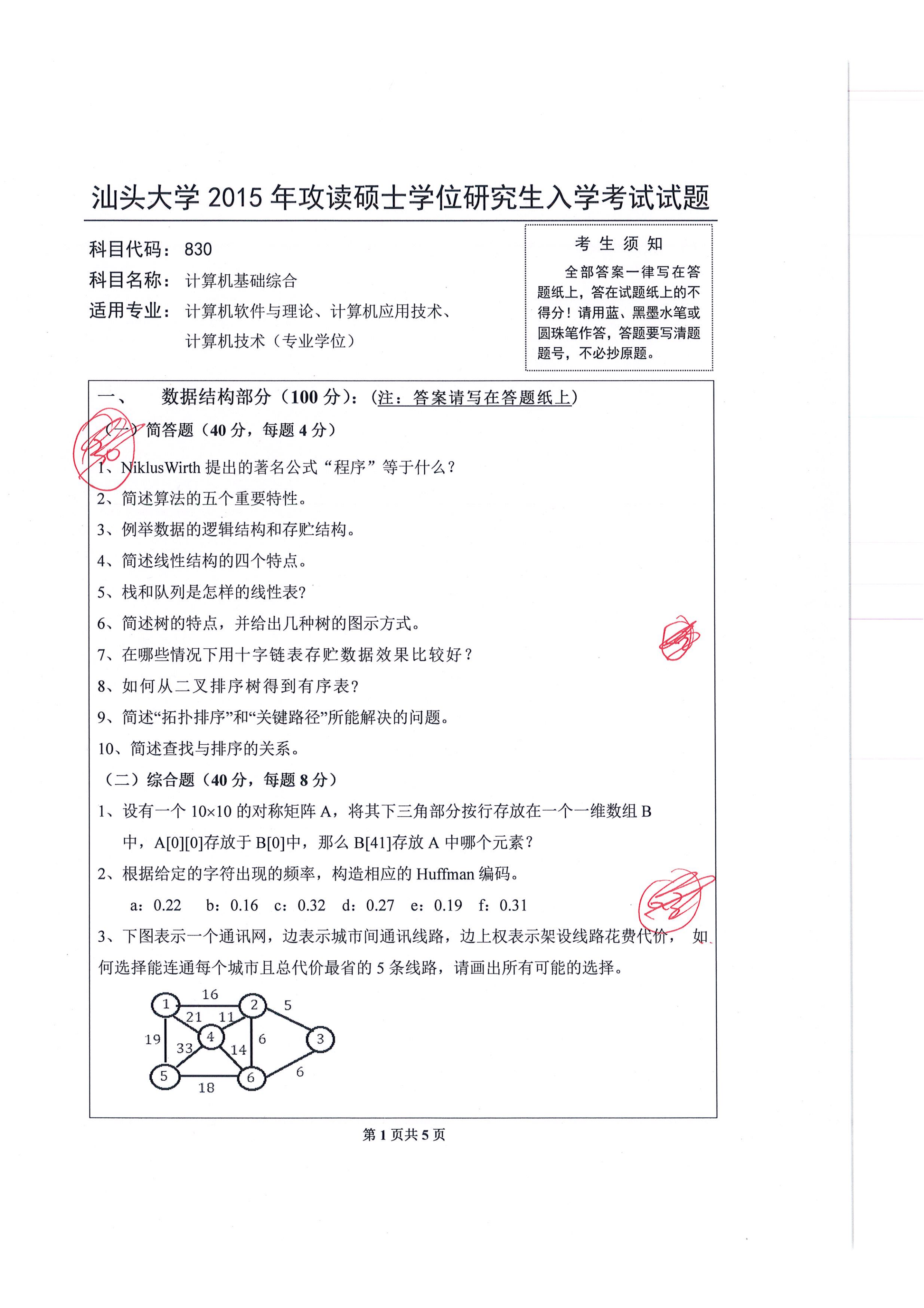 汕头大学考研辅导班:2015年汕头大学考研830计算机基础综合真题