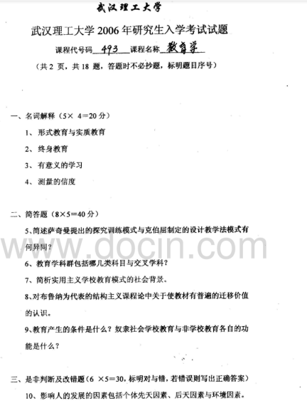 2020-2021年武汉理工考研辅导班:武汉理工大学618教育学2006年考研真题