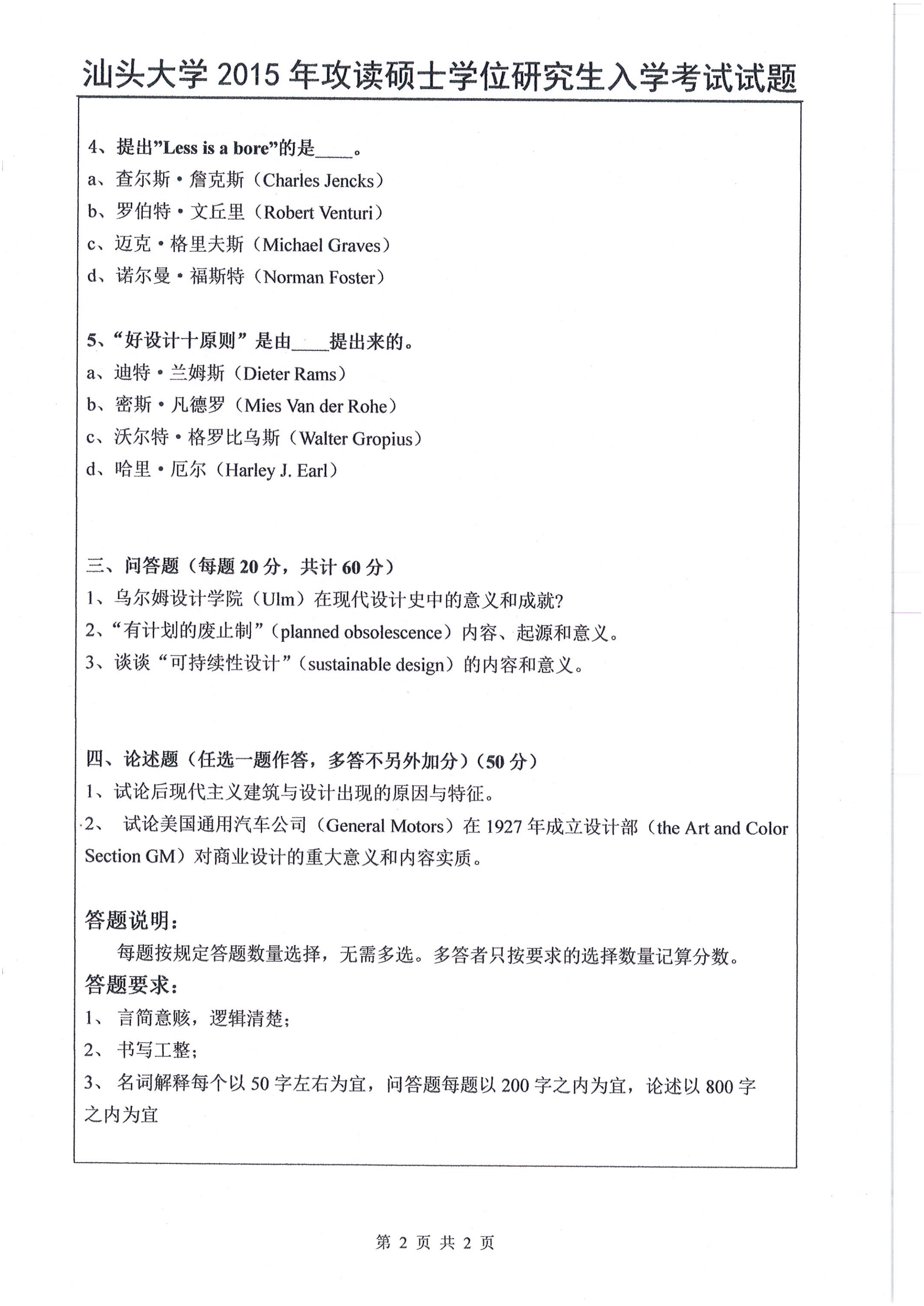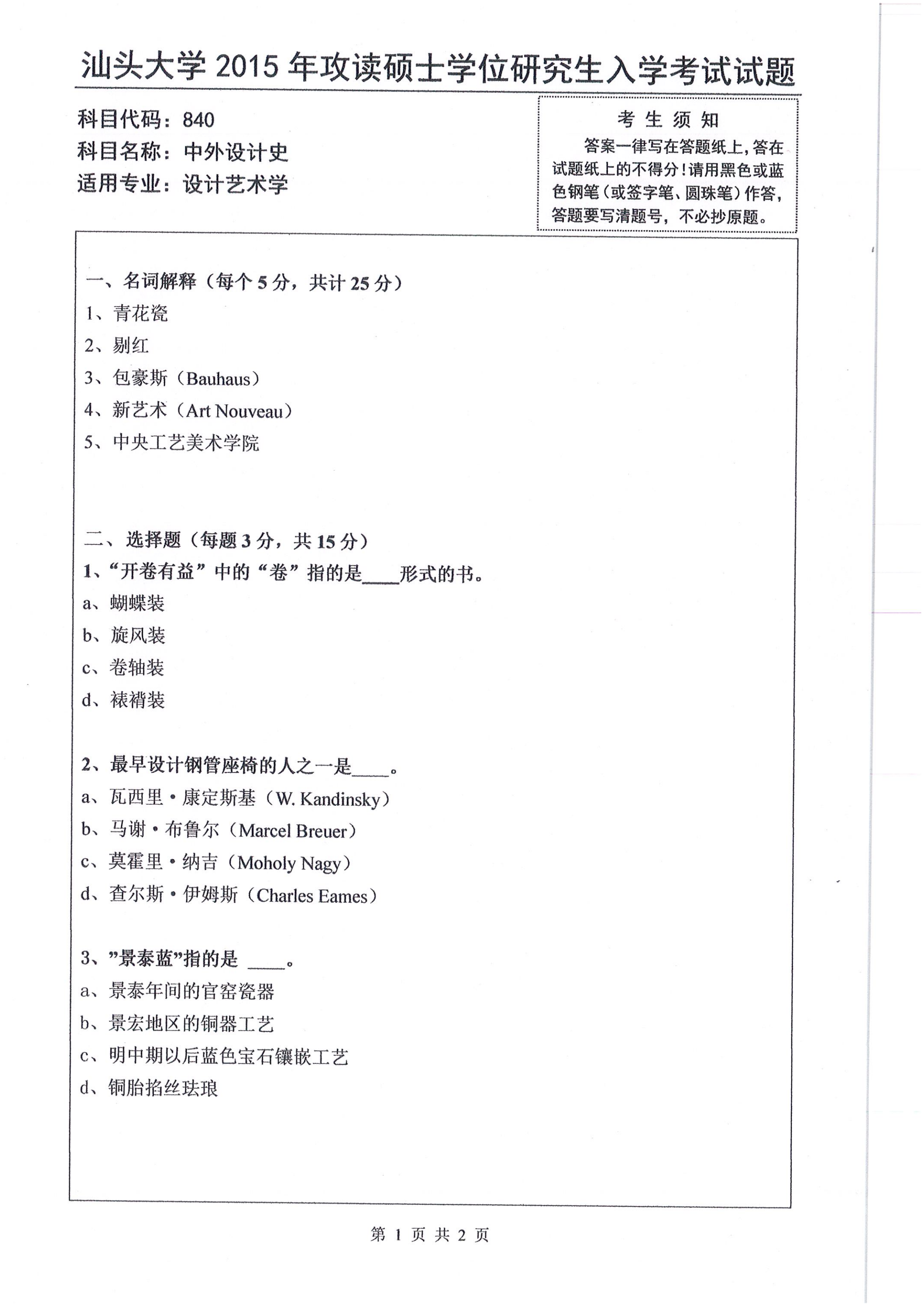 汕头大学考研辅导班:2015年汕头大学考研840中外设计史真题