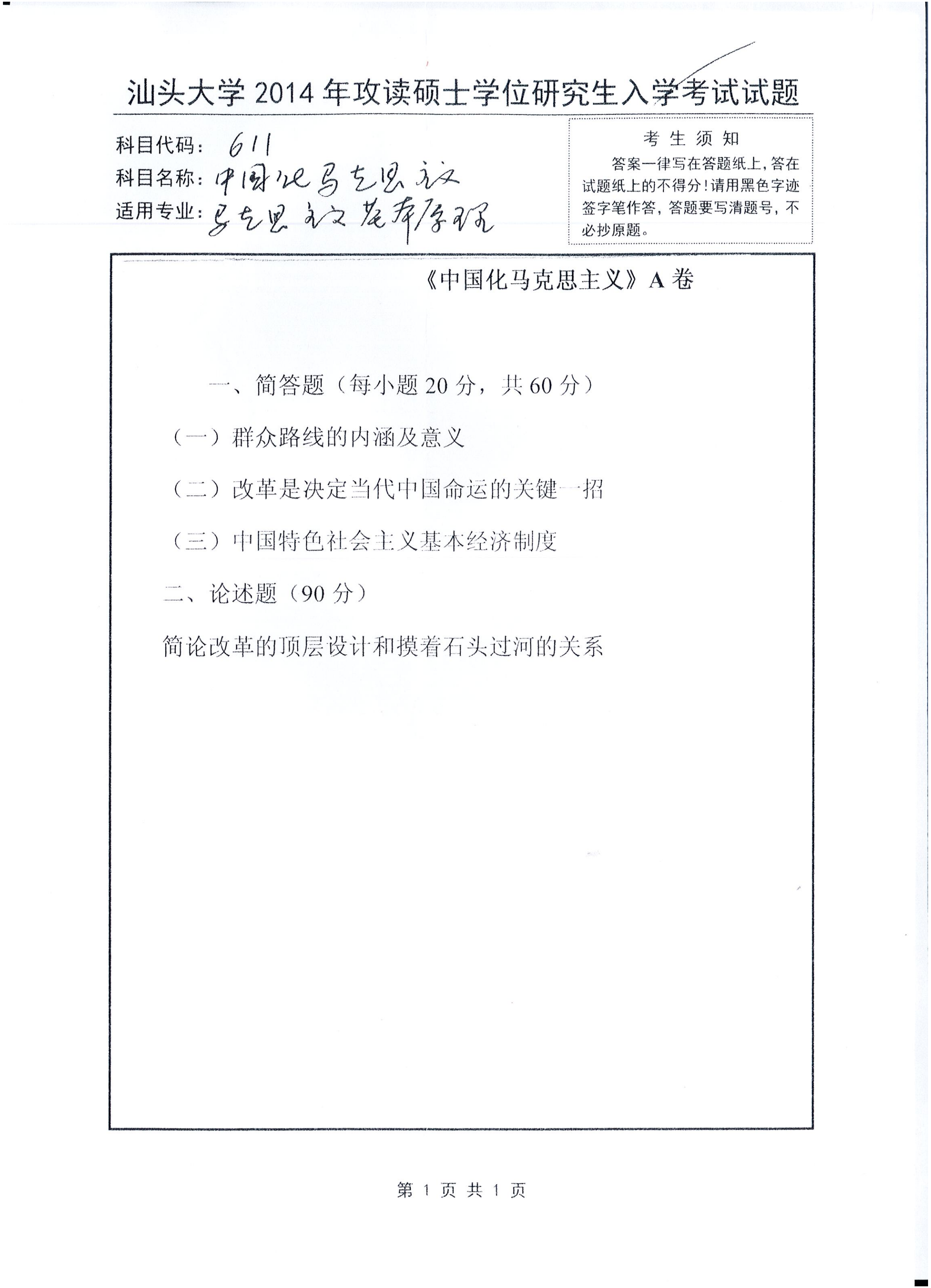 汕头大学考研辅导班:2014年汕头大学考研611中国化马克思主义真题