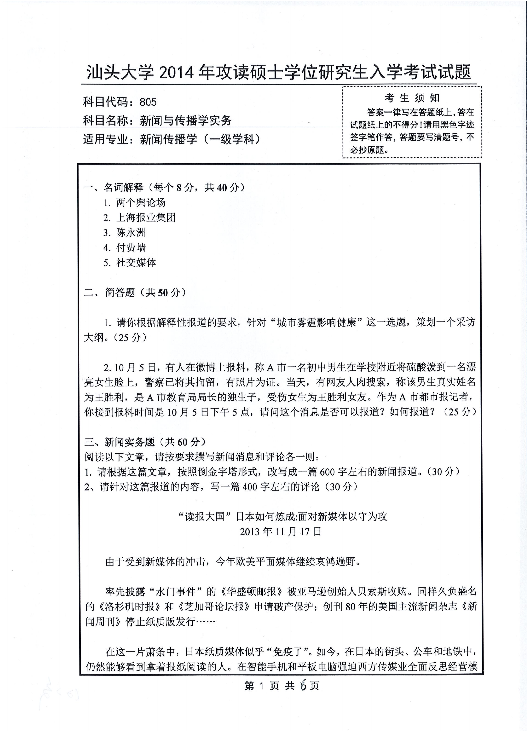 汕头大学考研辅导班:2014年汕头大学考研805新闻与传播学实务真题