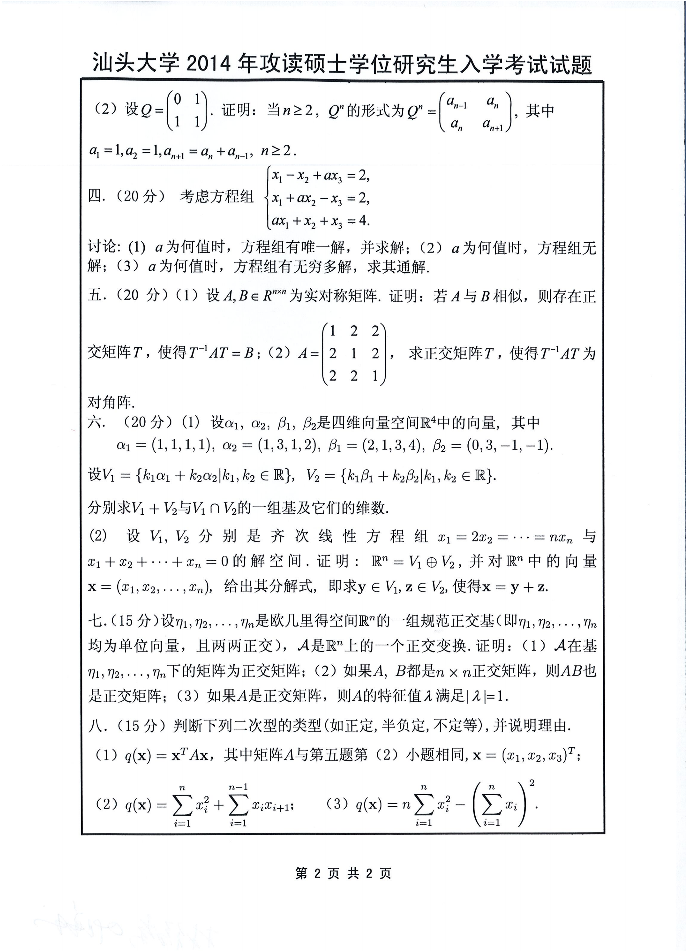 汕头大学考研辅导班:2014年汕头大学考研814高等代数真题