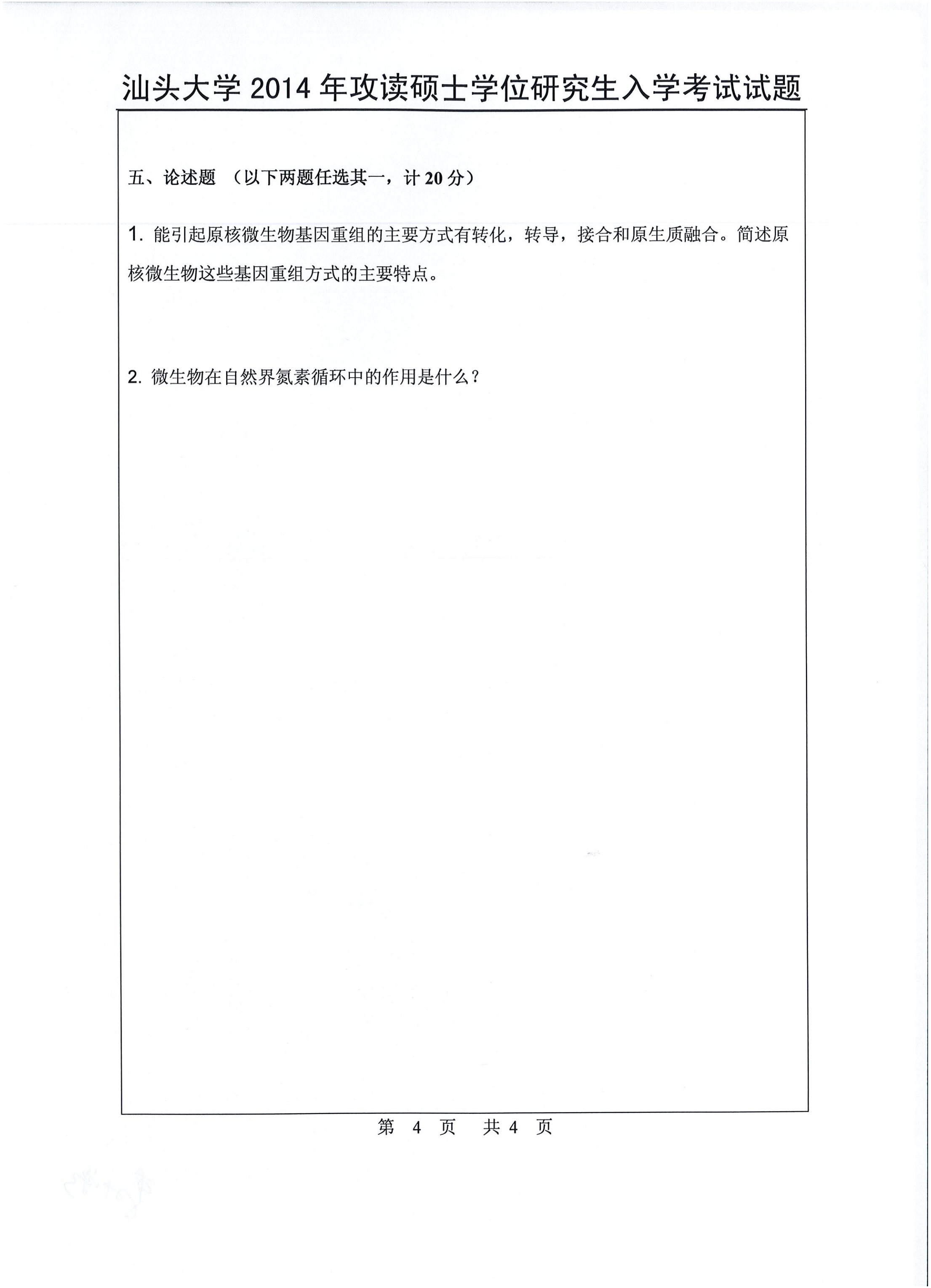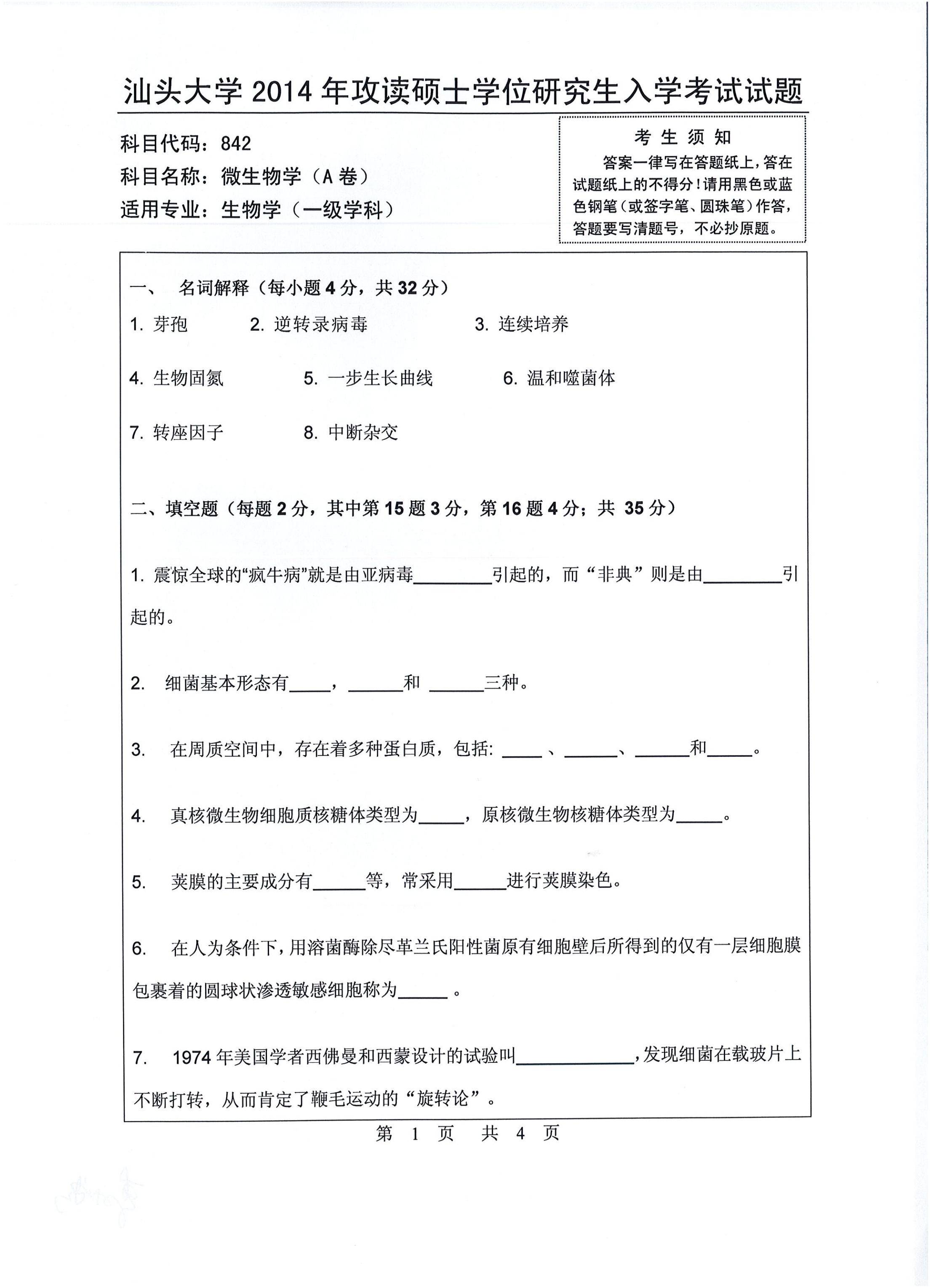 汕头大学考研辅导班:2014年汕头大学考研842微生物学真题