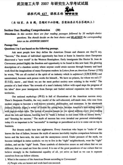 2020-2021年武汉理工考研辅导班:武汉理工大学619基础英语2007考研真题