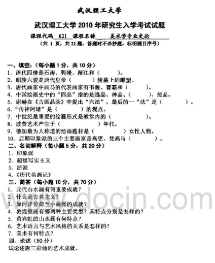 2020-2021年武汉理工考研辅导:武汉理工大学621美术学专业史论2010年考研真题