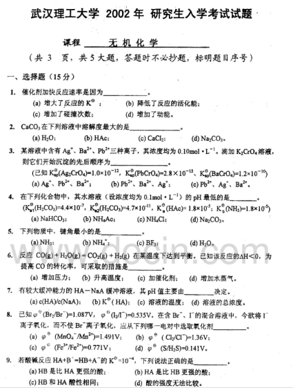 2020-2021年武汉理工考研辅导:武汉理工大学623无机化学2002年考研真题