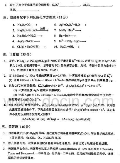 2020-2021年武汉理工考研辅导:武汉理工大学623无机化学2007年考研真题