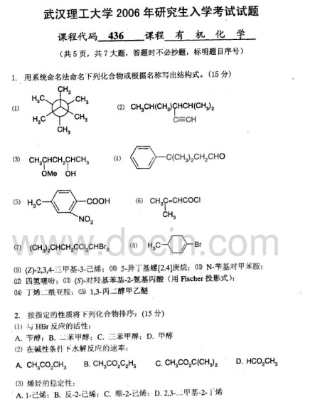 2020-2021年武汉理工考研辅导:武汉理工大学624有机化学2006考研真题