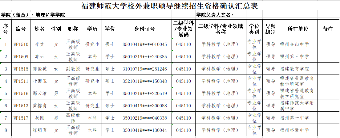 福建师范大学考研辅导班:福建师范大学校外兼职硕导继续招生资格确认汇总表
