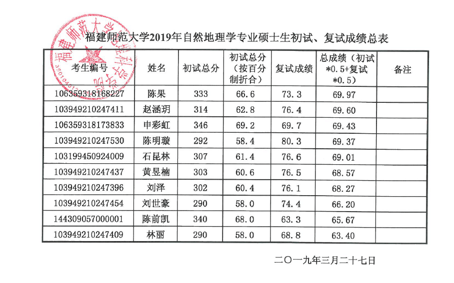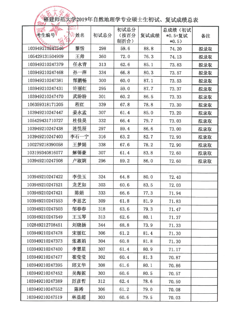 福建师范大学考研辅导班:福建师范大学2019年自然地理学专业硕士生初试、复试成绩汇总表
