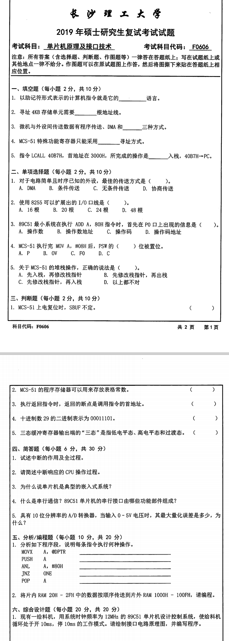 长沙理工大学考研辅导班:2019年长沙理工大学能源与动力工程学院考研复试F0606单片机原理及接口技术考试真题