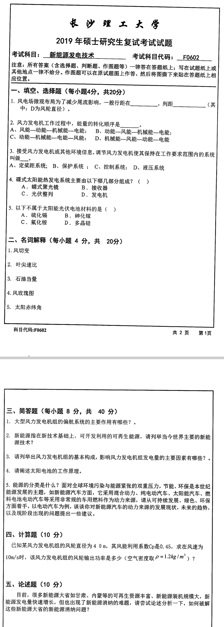 长沙理工大学考研辅导班:2019年长沙理工大学能源与动力工程学院考研复试F0602新能源发电技术科目考试真题