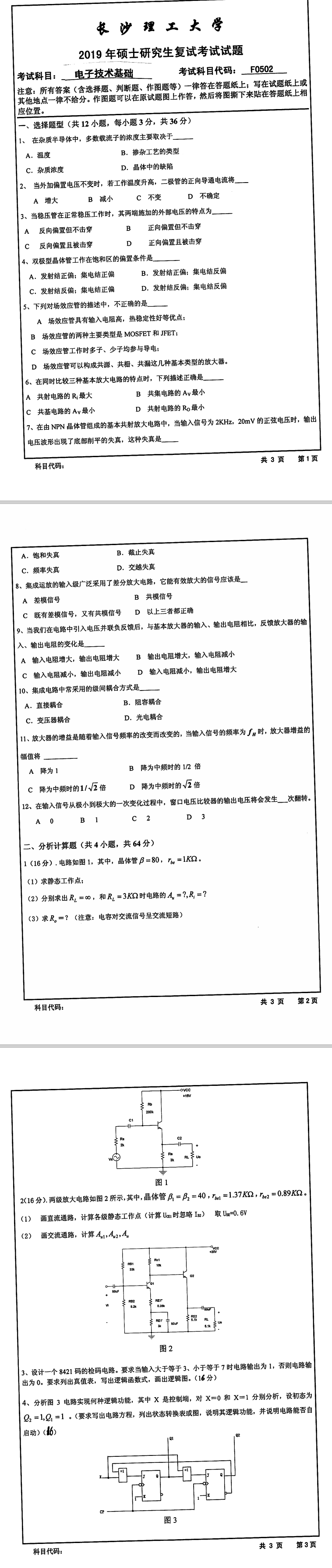 长沙理工大学考研辅导班:2019年长沙理工大学电气与信息工程学院学院考研复试F0502电子技术基础考试真题