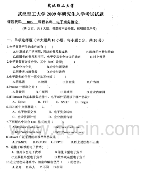 2020-2021年武汉理工考研辅导班:武汉理工大学805电子商务概论2009年考研真题