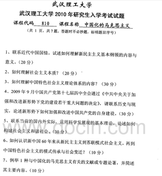 2020-2021年武汉理工考研辅导班:武汉理工大学810中国化的马克思主义2010年考研真题