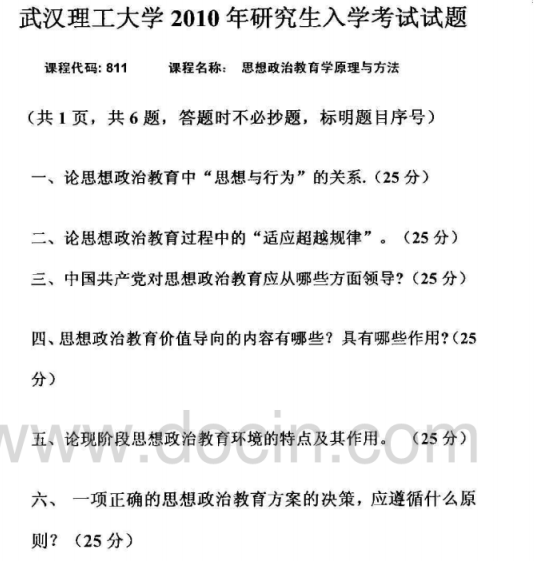 2020-2021年武汉理工考研辅导班:武汉理工大学811思想政治教育原理与方法2010年考研真题