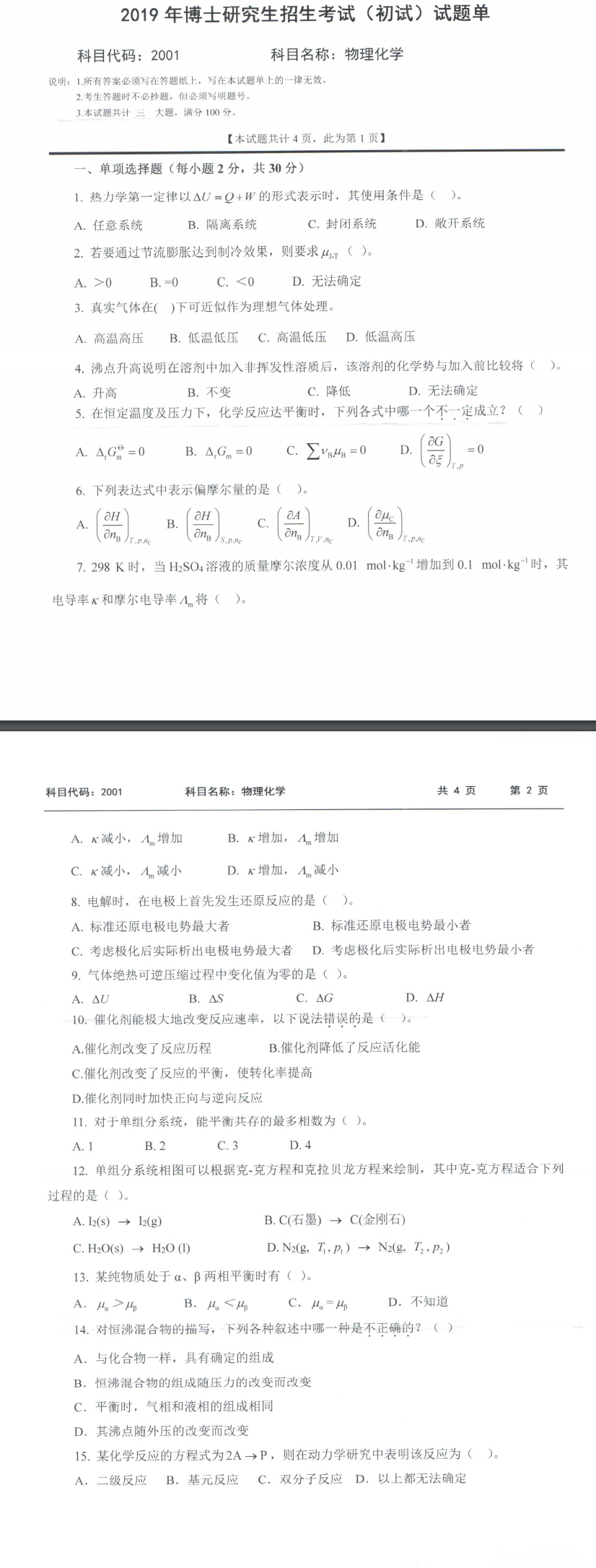 西南科技大学考博辅导班:2019年西南科技大学2001物理化学考博真题分享
