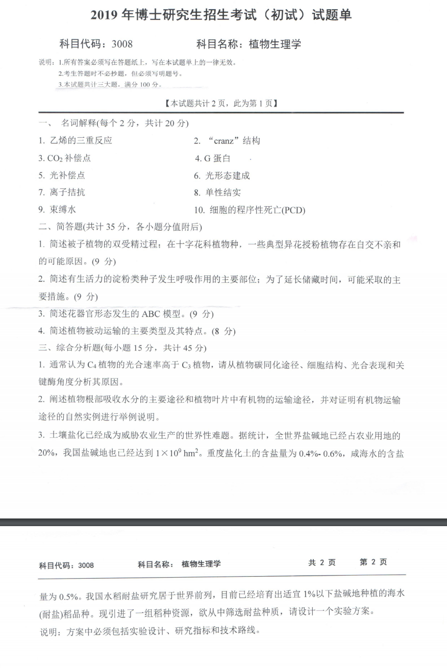 西南科技大学考博辅导班:2019年西南科技大学3008植物生理学考博真题分享