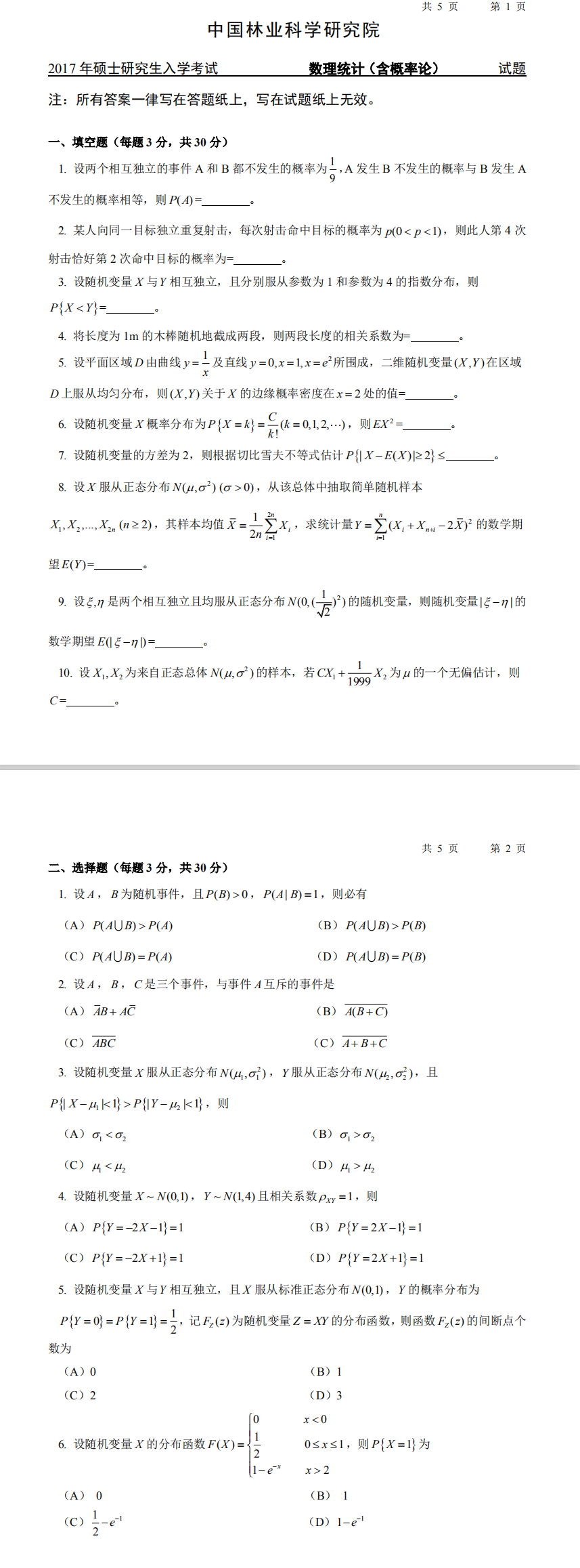 林科院考研辅导班:2017年中国林业科学研究院考研专业课701数理统计(含概率论)招生考试真题