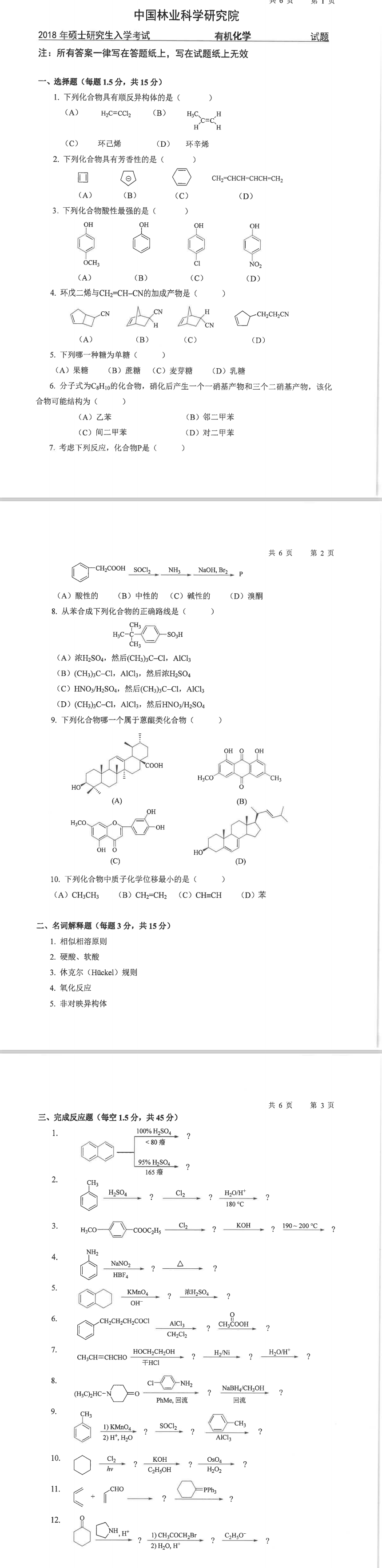 林科院考研辅导班:2018年中国林业科学研究院考研专业课806有机化学考试真题