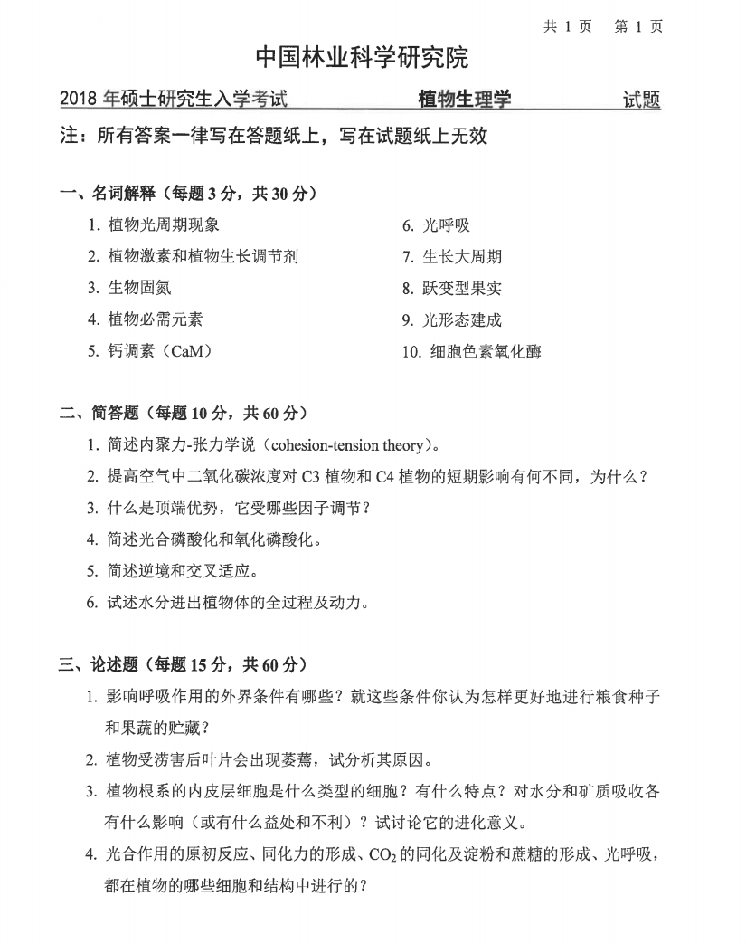 林科院考研辅导班:2018年中国林业科学研究院考研专业课811植物生理学考试真题