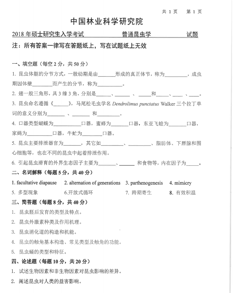 林科院考研辅导班:2018年中国林业科学研究院考研专业课813普通昆虫学考试真题