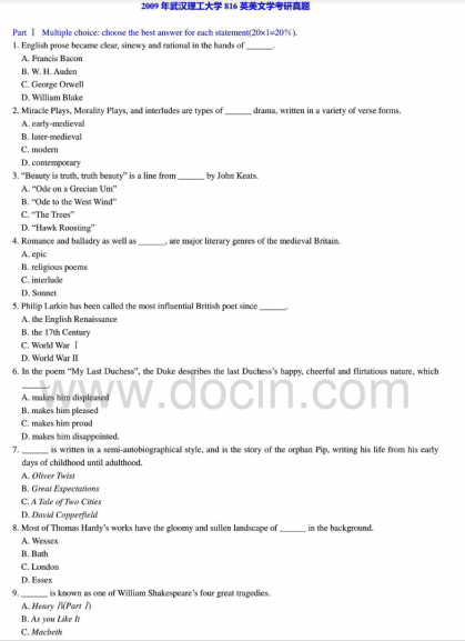 2020-2021年武汉理工考研辅导班:武汉理工大学816英美文学2009年考研真题