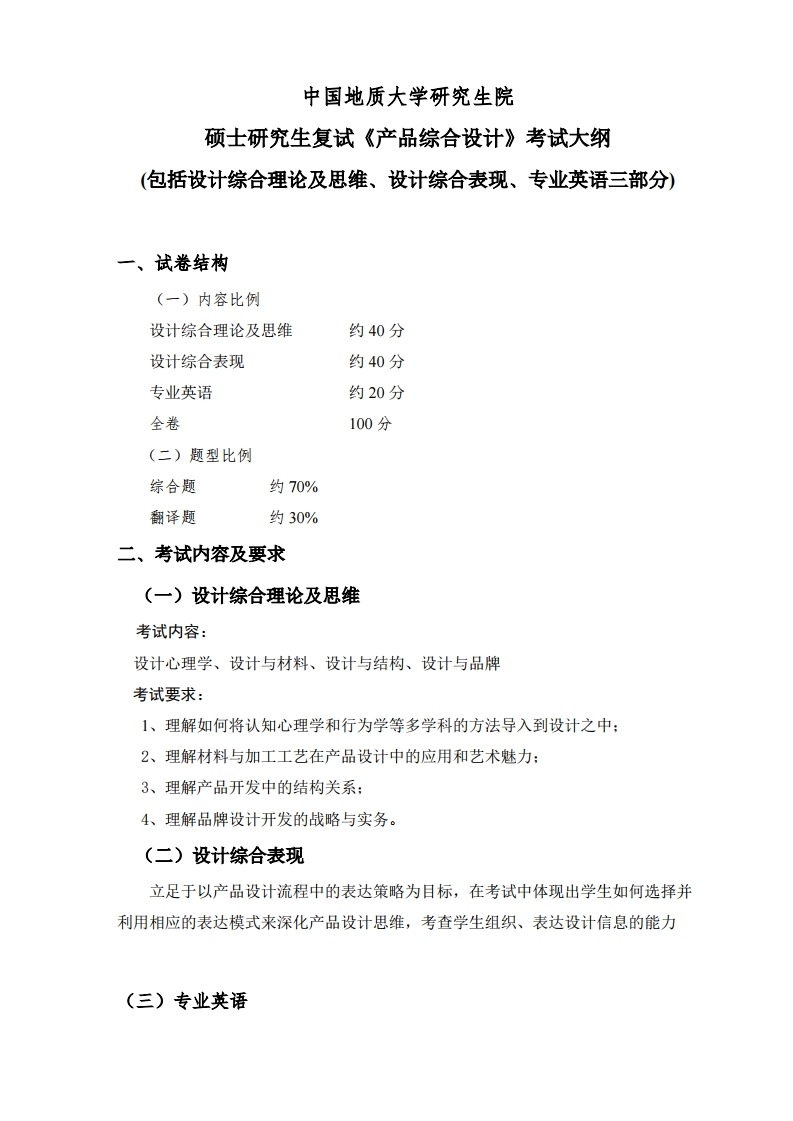 中国地质大学考研辅导班: 中国地质大学(武汉)2020年硕士研究生复试《产品综合设计》考试大纲