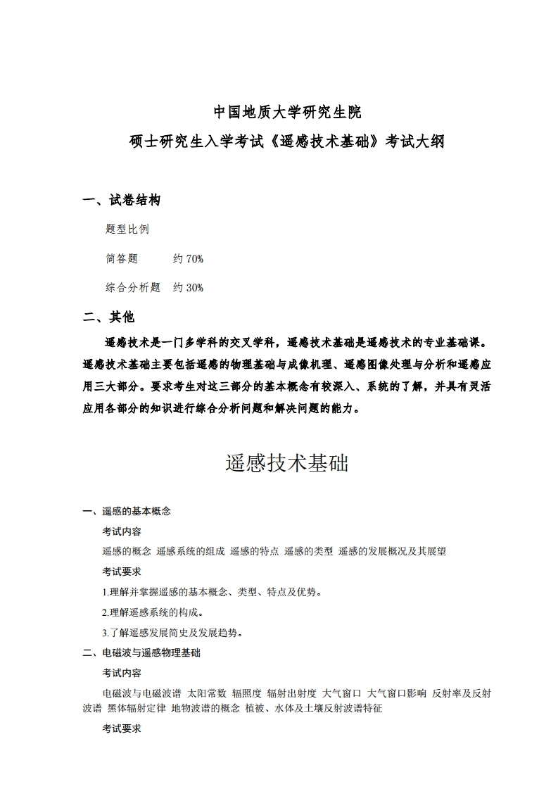 中国地质大学考研辅导班: 中国地质大学(武汉)2020年硕研初试考纲856遥感技术基础
