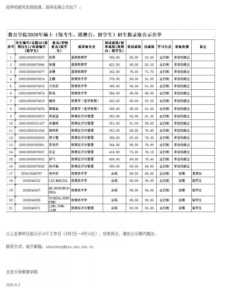 北大考研辅导班;北京大学2020年教育学院考研拟录取名单公布