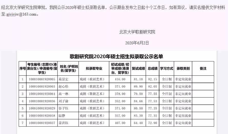 北大考研辅导班:北京大学歌剧研究院2020年考研拟录取公示名单