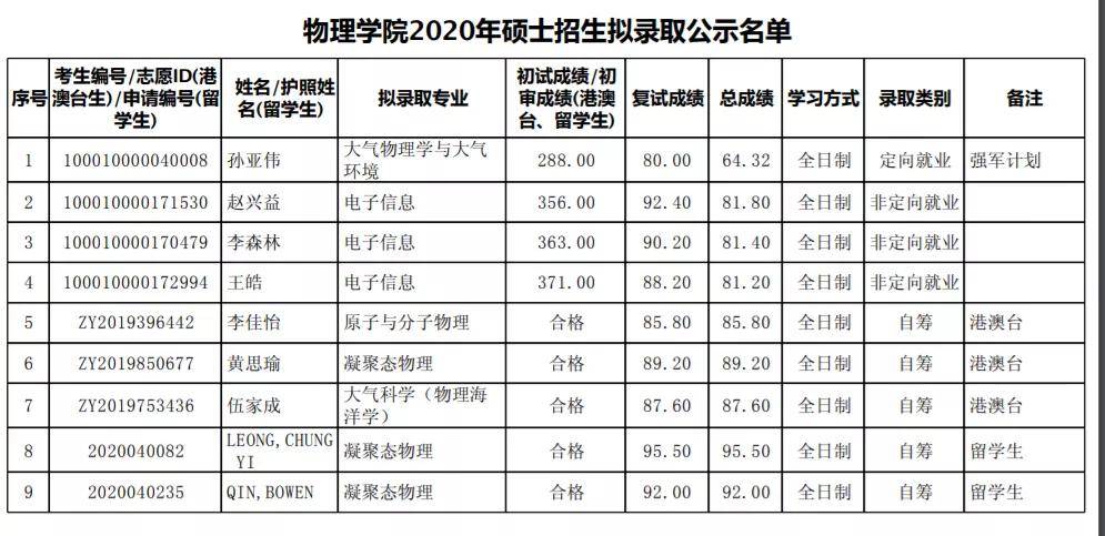北大考研辅导班:2020年北京大学物理学院2020年考研拟录取名单公示