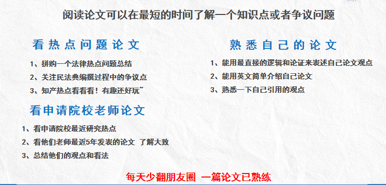 对于第五点,读论文真的是非常关键的环节,最好能保证复习过程中每天能看一篇论文,并把论文的关键思想和观点提取总结写出来。我建议大家先确定研究方向,然后选择一些这个方向目前最热最新的问题的论文来看。比如我就选择读了很多关于“人工智能法律问题”“中美贸易战与知识产权”“区块链与知识产权”“大数据法律问题”之类话题的论文,因为这些话题足够新足够热,对这些问题有一定了解甚至自己的见解,很容易在面试中脱颖而出。