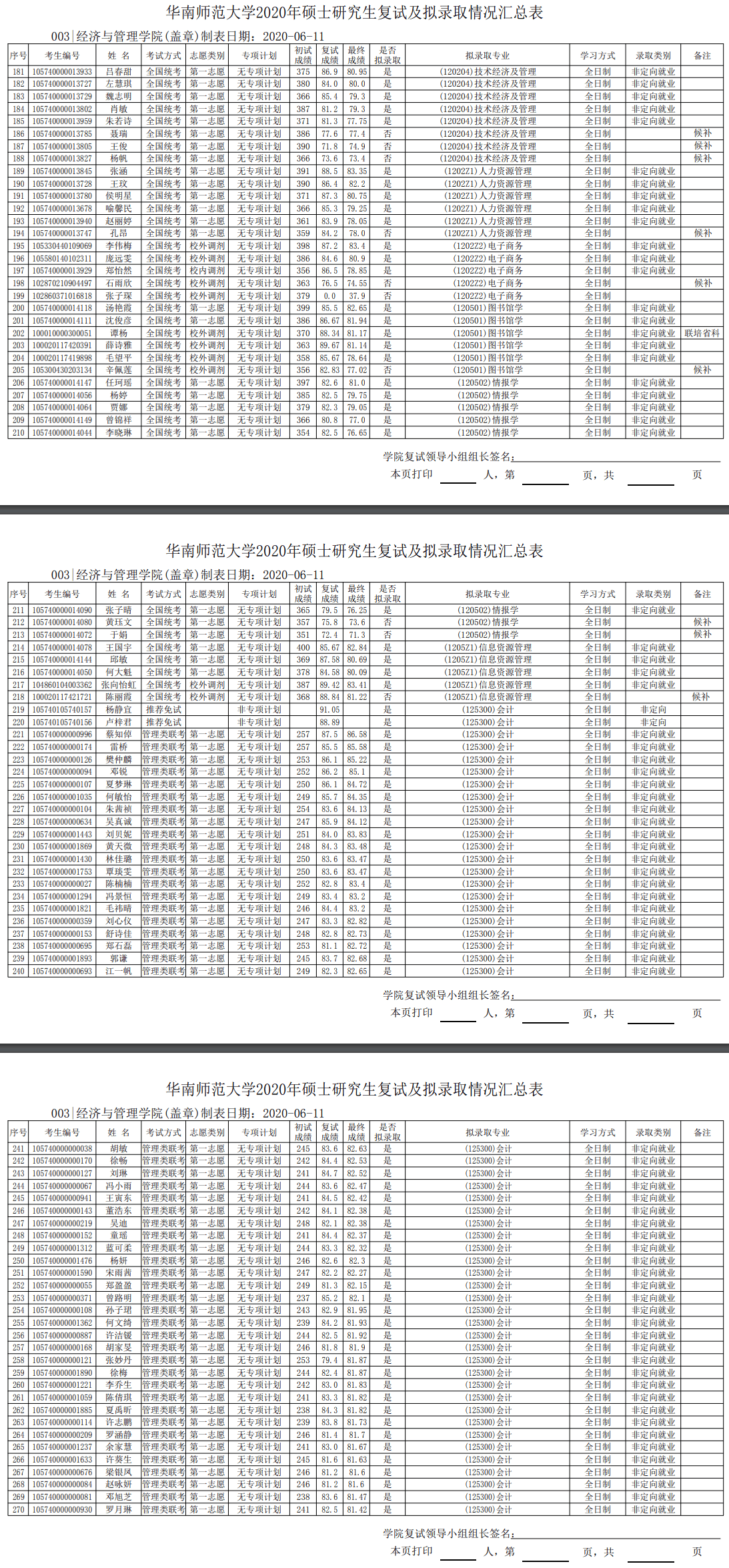 华南师范考研辅导班:2020年华南师范大学经管学院硕士研究生复试成绩及拟录取名单
