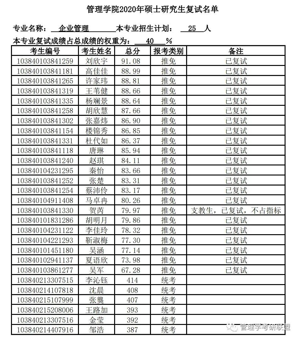 企业管理统考进入复试6人,最低分387,最高分414