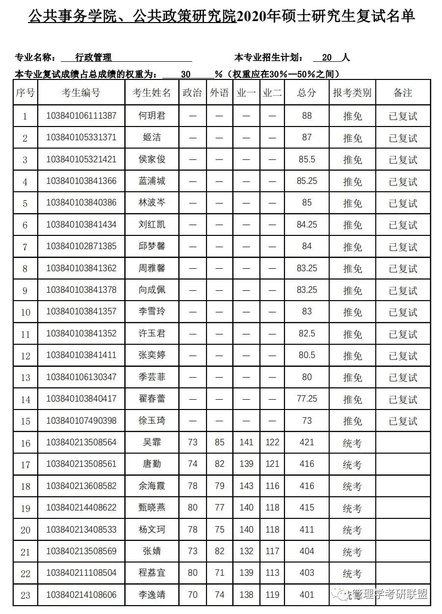 行政管理统考进入复试8人,最低分401,最高分421