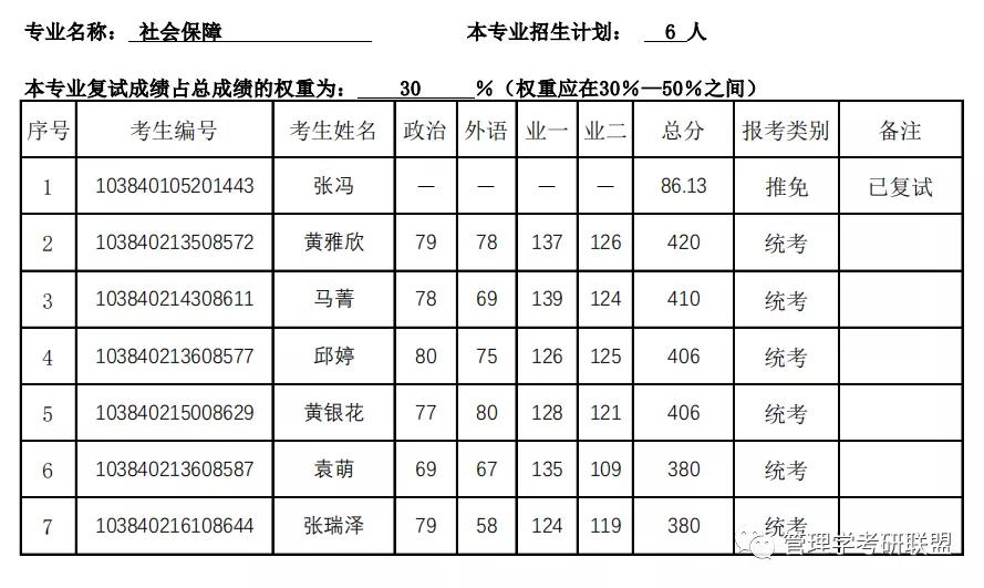 社会保障统考进入复试6人,最低分380,最高分420