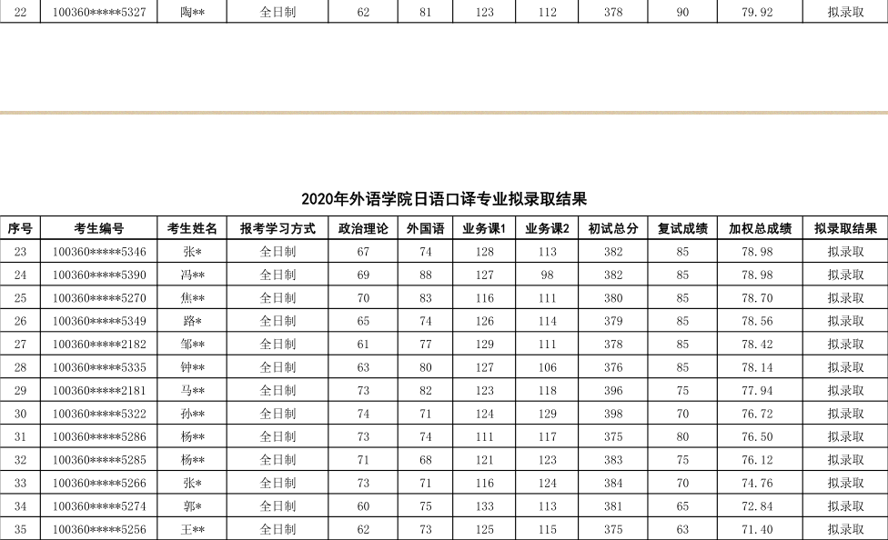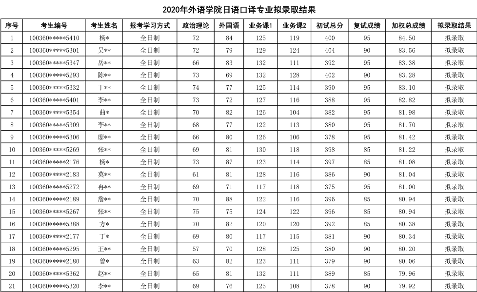 对外经济贸易大学日语口译2020年硕士研究生录取名单