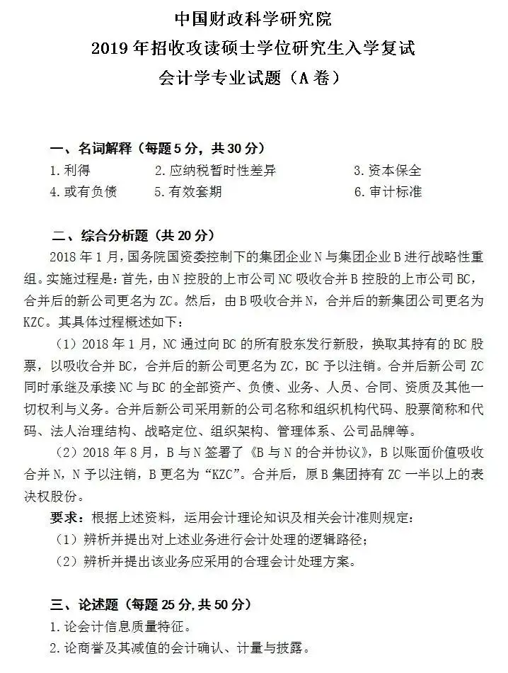 2019会计学专业复试真题: