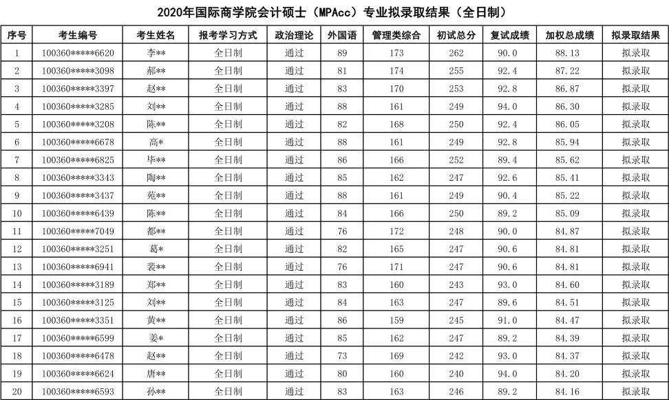 对外经济贸易大学会计硕士(MPAcc)2020年硕士研究生录取名单