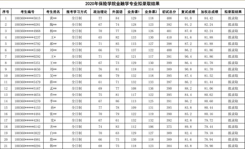 对外经济贸易大学保险学院金融学2020年硕士研究生录取名单