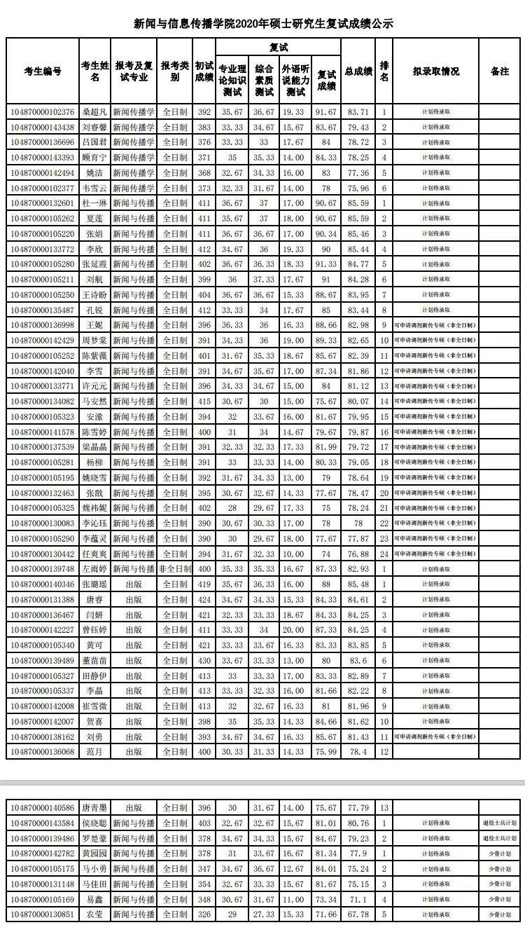 2020华中科技大学新闻与信息传播学院硕士研究生复试成绩