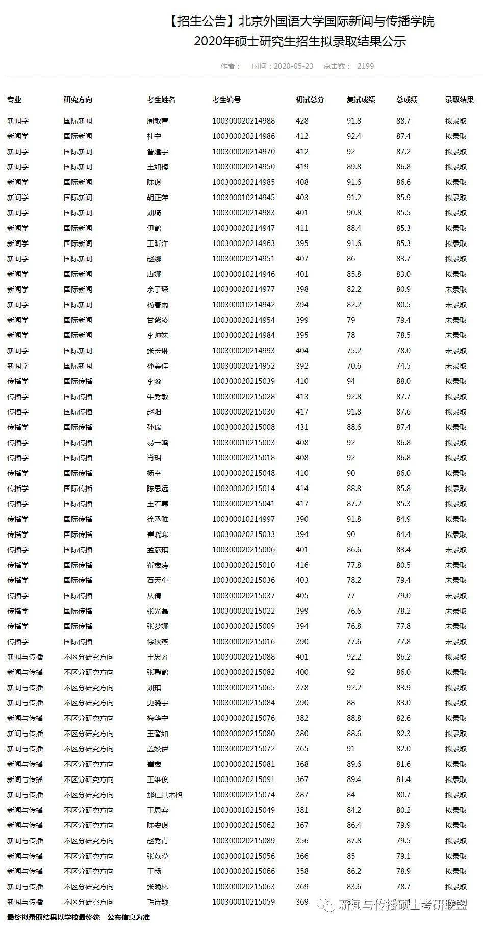 北外考研辅导班:2020北京外国语大学国际新闻与传播学院硕士研究生拟录取名单公示
