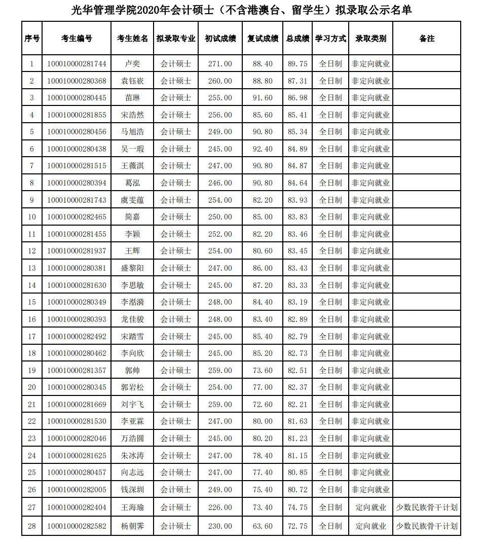 会计硕士统考拟录取28人,含少干2人,最低分245,最高分271