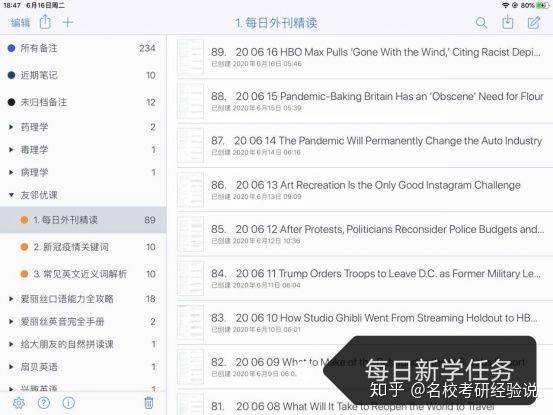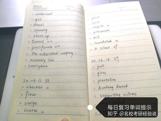 7月份之前为打基础阶段,主要学习单词、语法及长难句。语法及长难句部分由于个人有一定的基础,没有再系统学习,故不赘述。单词部分我使用的是朱伟老师的《题源报刊7000词》,这本书的例句有一定的难度,并且是来源于其他外刊而不是真题,因此既能背大量的词汇,又不会影响到后续做真题检测的准确度。由于我意志力不强,机械性的背单词方法难以坚持,故琢磨出了一套即没有压迫感、容易坚持又记忆效果很好的背单词方法,主要利用艾宾浩斯记忆曲线,也许不适合所有人,但还是在这里介绍一下,希望可以给和我一样的学弟学妹们提供一个选择:①每天分配一定量的新的学习任务(比如一节单词课的内容或一篇短文的全部生词),注意每天的新学任务量不要过多,因为到后续每天复习的量会很大,会产生抵触心理,难以坚持,细水长流才能实打实得进步。②将每天新学的单词/语言点单独写在一个本上或笔记软件中,笔记好日期,作为每天复习的提示(注意只写英文,不写汉语意思)③根据艾宾浩斯记忆曲线进行复习,复习前先看提示,标记出无法认出的单词,再看一遍相应单词书原文或文章原文(注意无需机械背诵,只需每日根据复习任务认真看一遍相应内容即可)。这个方法我在7月份之前背单词书时用过,在后续背真题阅读单词时用过,现在每天学习外刊时也在用,以前尝试过用APP背,尝试过自己硬着头皮看新东方绿皮书,不仅坚持不了,而且效果差,而且很多单词的特殊用法,单纯靠背是接触不到的,只有根据文章、例句才能学习到。