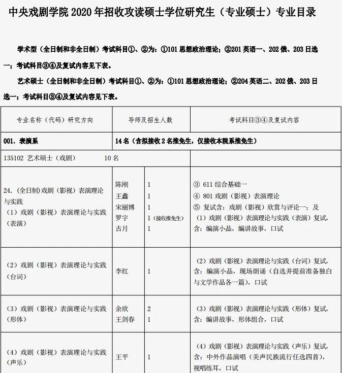 @招生目录 @参考书目(题型详解) (后台回复“中戏参考书目”获取更多中戏参考书) 611综合基础一: 2、《戏剧表演基础》 4、《演员创造角色》 6、《表演心理学》 8、《音乐剧演员的培养》 @历年分数线 普通考生 年份 政治 英语 业务课一 业务科二 总分 2020 38 38 90 90 347 2019 38 38 90 90 340 2018 36 36 90 90 335 2017 35 35 90 90 335 2016 34 34 90 90 335 少数民族高层次骨干人才计划 年份 政治 英语 业务课一 业务科二 总分 2020 - - - - 248 2019 - - - - 248 2018 - - - - 245 2017 - - - - 245 2016 - - - - 245 港、澳、台地区考生 年份 政治 英语 业务课一 业务科二 总分 2020 - 38 70 90 - 2019 - 38 70 90 - 2018 - 36 70 90 - 2017 - 35 70 90 - 2016 - 34 70 90 - @历年录取人数 待更新... @历年考研真题 (后台回复“中戏真题”获取更多中戏历年真题) 2020戏管专硕考研真题: 专业一:621综合基础十一 名词解释: 洪深 窈窕淑女 话剧 戏剧悬念 南麟北马关外唐 忘我 教育剧场 转场里的叠化 1. 戏剧制作成本 2. 戏剧剧组 3.演出项目评估 演出营销 阐述剧院发展规划的要点(不少于2000字)